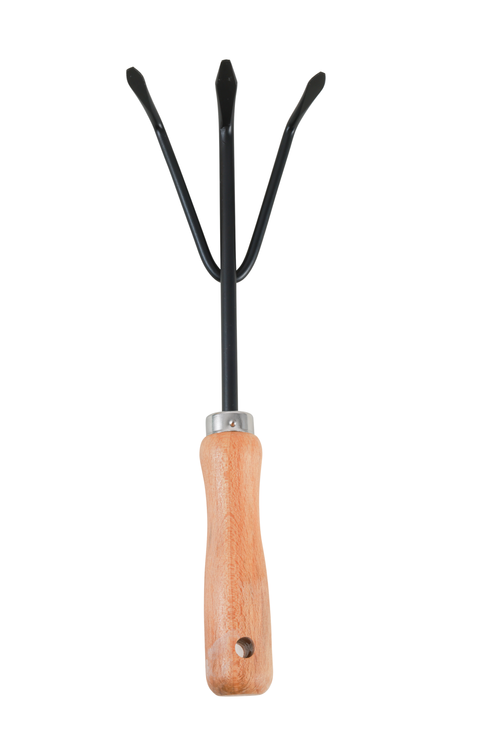 Sturdy wooden-handle cultivator, ideal for loosening and aerating soil in gardening tasks.