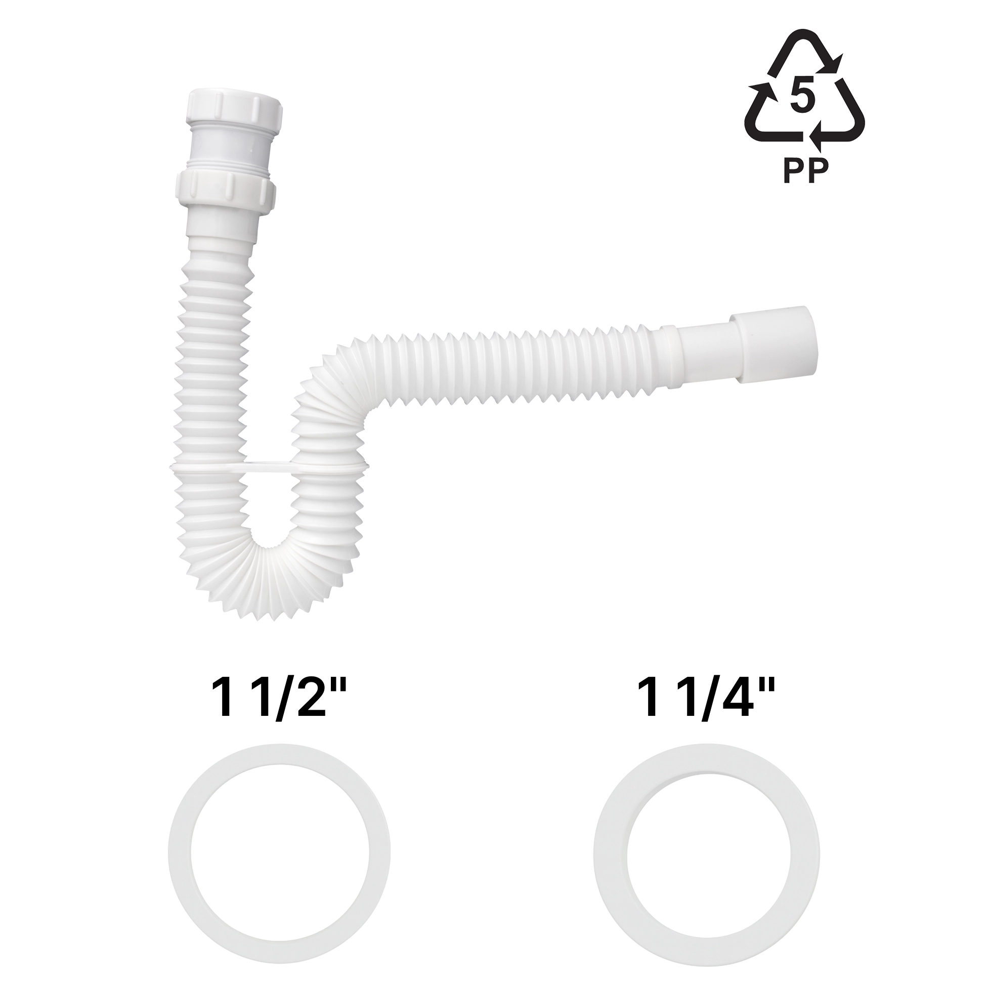 Extra-long corrugated white extension made of flexible polypropylene for easy installation and stable drainage.
