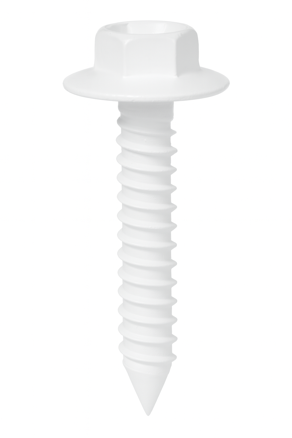 White hex washer head Tapcon screw engineered for anchoring pipes and hardware securely into concrete surfaces, offering reliable grip and long-lasting performance.