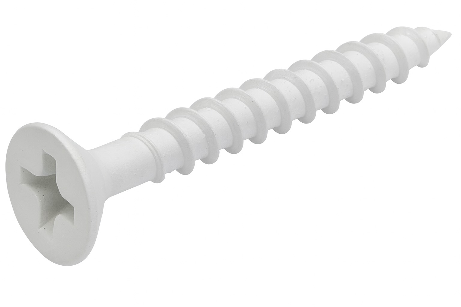 White flat head Tapcon screw designed for fastening pipes and fixtures into concrete or masonry without the need for plastic anchors, providing strong and secure holding power.