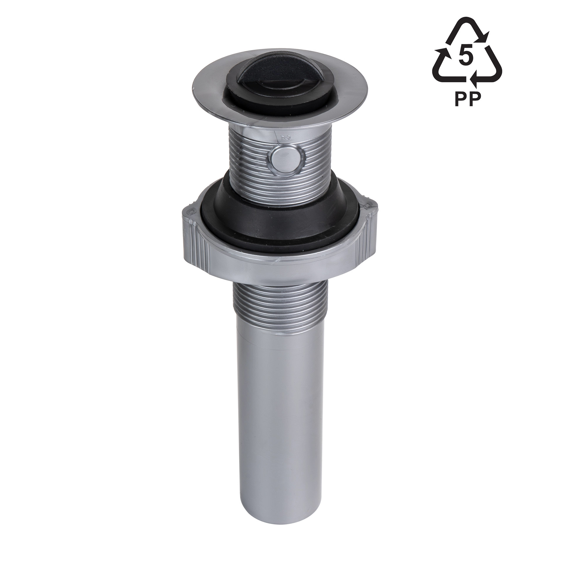 Gray pop-up drain plug made of durable polypropylene providing a secure seal and efficient drainage.