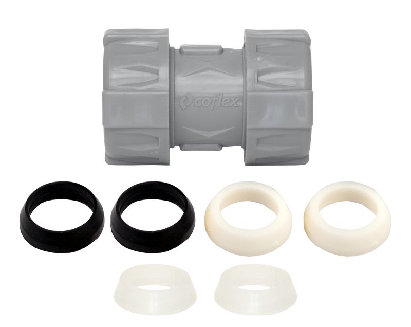 Quick and secure repair coupling made of polypropylene and santoprene, compatible with PVC, copper, CPVC and PPR piping.