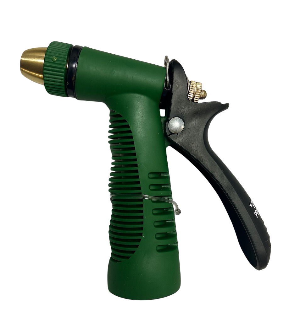 Rubberized two-function spray gun with a firm, comfortable grip for home watering.